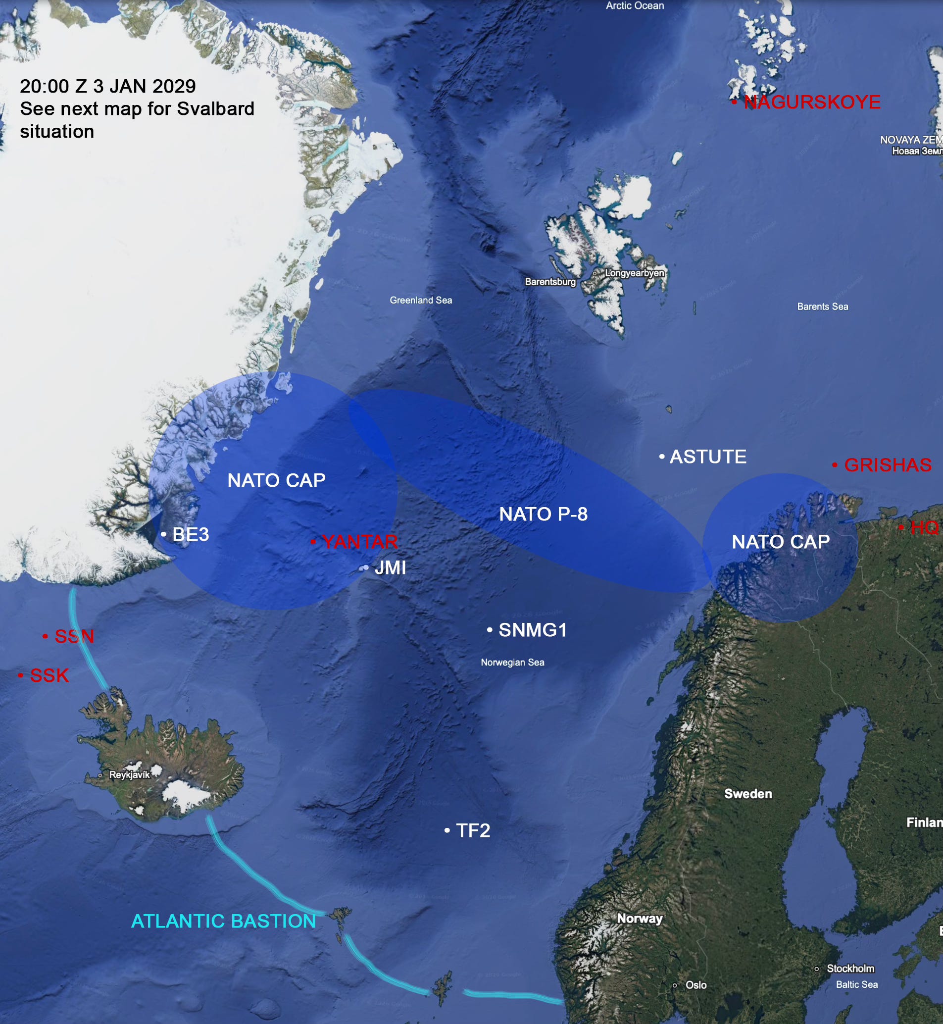 Danish F-35s begin Combat Air Patrols (CAP) over Eastern Greenland, with NATO tanker support. Danish and Norwegian transport aircraft begin ferrying infantry, medium-range GBAD and mobile radar installations to Bluie East 3 and Jan Mayen Island.